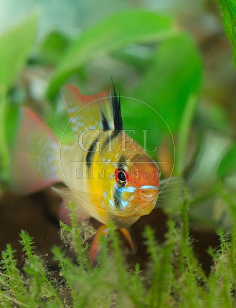 - Ansicht, frontal, vorne, profil, seitlich, seite, Anzahl, 1, eins, einer, einzelner, Aussenaufnahme, draussen, Wasser, erwachsener, erwachsenes, Alttiere, Gegenstaende, Aquarium, Aquarien, Taetigkeiten, schwimmen, schwimmt, Tiere, Fische, Schmetterlingsbuntbarsche, Heimtiere, Haustiere, , Mikrogeophagus ramirezi
