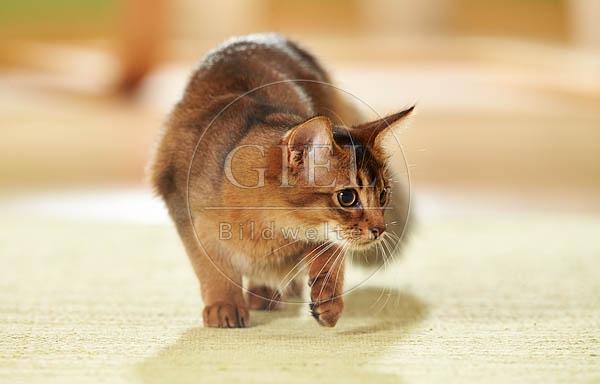 - Ansicht, frontal, vorne, Anzahl, 1, eins, einer, einzelner, erwachsener, erwachsenes, Alttiere, Taetigkeiten, anschleichen, schleicht, gehen, geht, Tierkinder, Tierbabys, junger, junges, jungtiere, Wohnung, drinnen, Teppiche, Teppichboden, Tiere, Heimtiere, Haustiere, Saeugetiere, Katzen, Somali, ,