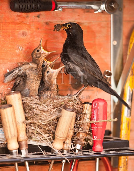 - Ansicht, profil, seitlich, seite, Anzahl, 3, drei, mehrere, 4, vier, mehrere, Aussenaufnahme, draussen, erwachsener, erwachsenes, Alttiere, Gegenstaende, Werkzeug, Werkstatt, Taetigkeiten, betteln, bettelt, fuettern, gefuettert, Tierkinder, Tierbabys, junger, junges, jungtiere, Kueken, Tiermutter, Tiere, Details, Tiere, Nistmaterial, Nestbau, Voegel, Amsel, Details, Voegel, Vogelnester, Wildtiere, , Turdus merula